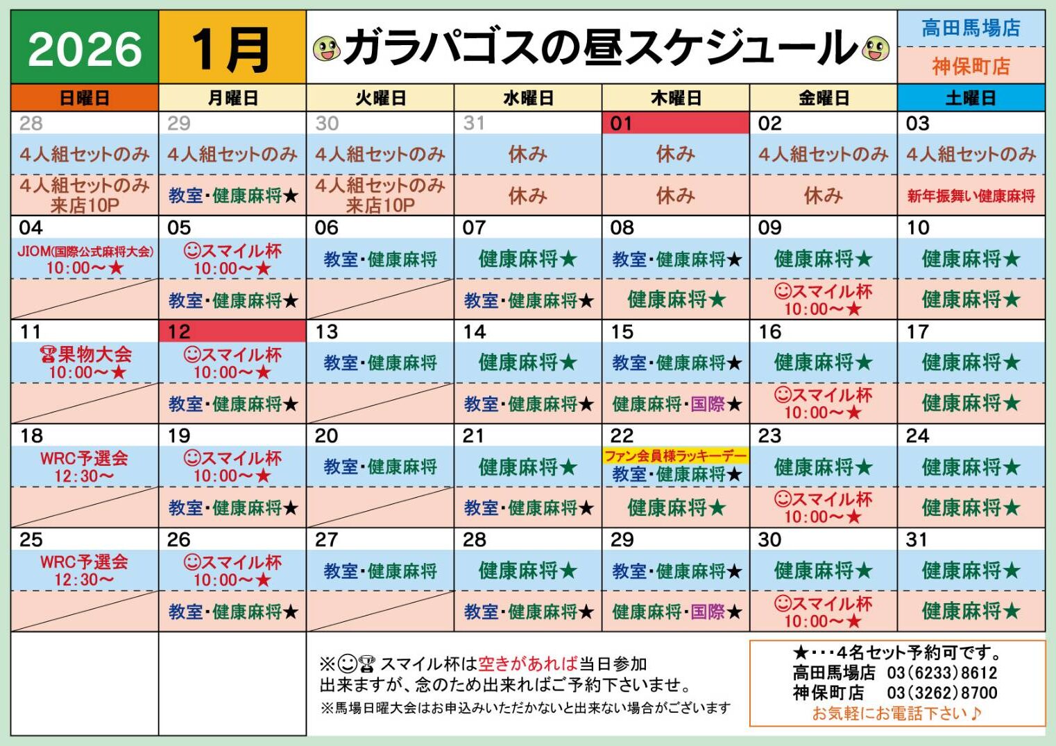 ガラパゴス神保町店では毎日曜日ごとに健康麻将・麻雀教室などが開催されています。