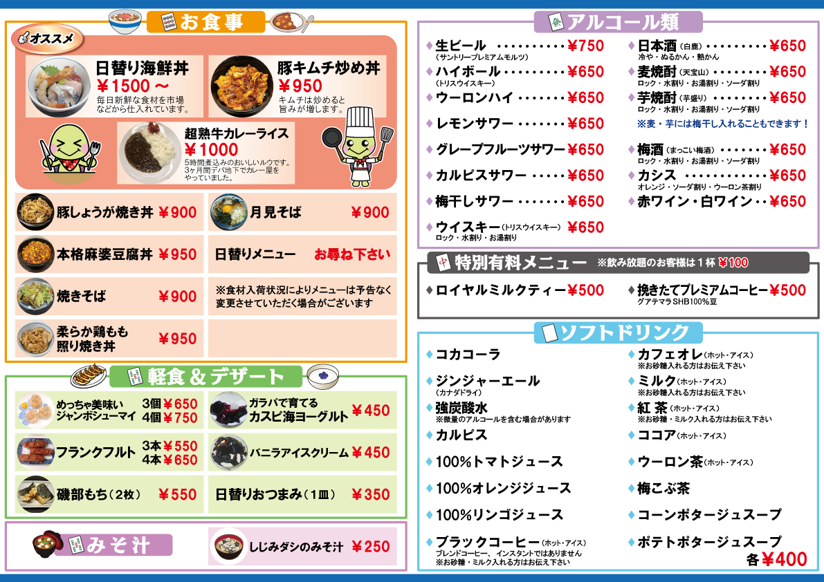 | 学生パック 17:00~23:30 カレーライス大盛り+3時間飲み放題 | 3200円 |